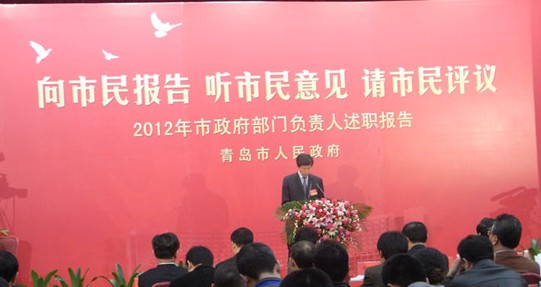 ????昨天下午,青島市政府部門2012年工作述職報(bào)告第二場在青島市勞動(dòng)服務(wù)審批大廳4樓舉行。青島市教育局、市民政局、市人力資源社會(huì)保障局、市市政公用局等13個(gè)部門主要負(fù)責(zé)人向市民做了報(bào)告,現(xiàn)場接受青島市民的監(jiān)督與評(píng)議。