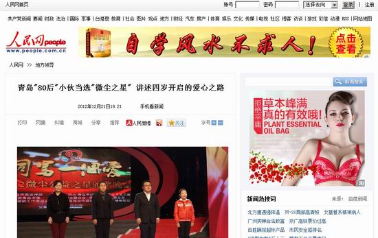 青島新聞網(wǎng)青青島社區(qū)版主“故事”的事跡,被人民網(wǎng)轉(zhuǎn)載報(bào)道。正如“最美乘務(wù)員朱麗”、“最美公交司機(jī)”、“浮山環(huán)保哥”等優(yōu)秀人物一樣,青島眾多愛(ài)心市民、愛(ài)心網(wǎng)友的事跡,不斷成為全國(guó)典型,通過(guò)中央級(jí)媒體不斷在全國(guó)范圍內(nèi)廣為傳播,為青島這座愛(ài)心之城添加了一抹又一抹亮麗的色彩。(點(diǎn)此查看人民網(wǎng)報(bào)道)