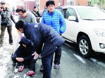 昨天中午12時(shí)左右,雪下得正大,從頤中高山小區(qū)駛出的一輛福特全順商務(wù)車沿著旌德路行駛,司機(jī)一腳油門,整輛車向著路邊人行道沖過去,這時(shí)人行道上走著一對(duì)抱著小孫女的老夫婦和一名中年婦女。商務(wù)車司機(jī)猛打方向盤,撞向路邊的墻壁,但仍然將3人撞倒在地,兩歲半的小女孩從奶奶懷里摔了出去,倒在了兩米外的地上(見圖)。