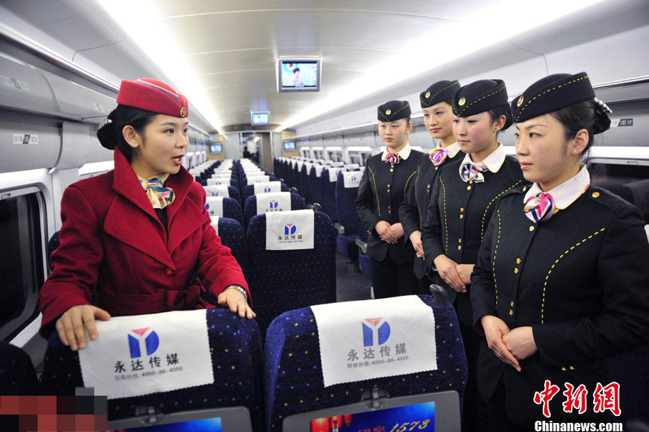 12月19日,西安客運段的高鐵乘務員正在進行服務技能訓練。近日,西安鐵路局西安客運段動車隊對即將上崗的西安至北京高鐵乘務員進行服務禮儀、安全作業(yè)等方面的強化培訓,為京廣高鐵正式開通運營做準備。京廣高鐵北京至鄭州段將于12月26日開通運營,鄭西高鐵同步調整列車運行圖。屆時,西安至北京將開行10對高鐵動車組列車,最短運行時間為4小時40分。(中新社發(fā) 唐振江 攝)