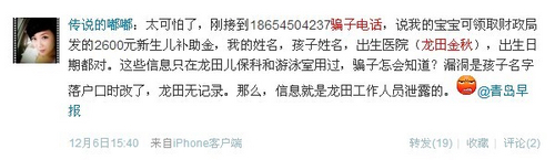 ????青島新聞網(wǎng)12月21日訊 近日,青島新聞網(wǎng)頻繁接到網(wǎng)友爆料,稱有人冒充婦產(chǎn)醫(yī)院,要求新爸媽“到財政局領取生育補貼”,騙術拙劣,幾乎沒人相信。可令人擔憂的是,騙子在電話里,能夠準確說出家庭住址、寶寶出生年月、電話號碼等信息,這讓新爸媽感到納悶:“到底誰出賣了寶寶的信息?”
