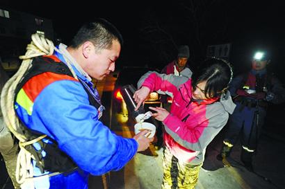 前天夜里10時(shí)35分,記者站在嶗山腳下的太清派出所門前,看著雨從陰霾的天空滴落,對(duì)講機(jī)里傳來搜救人員的聲音,嶗山上已經(jīng)開始下雪了。所有的救援人員都知道,在嶗山這樣陡峭的山間行走,積雪不但會(huì)掩蓋掉山間崎嶇的小路,甚至?xí)屗丫热藛T一腳踩空墜落懸崖,但山上的24名搜救隊(duì)員并沒有因?yàn)槲kU(xiǎn)而放棄,他們沒有攜帶足夠的糧食和水,沒有攜帶足夠防寒的衣物,沒有攜帶冰爪等專業(yè)設(shè)備,但他們?nèi)匀辉趫?jiān)持,因?yàn)樗麄冎?,被困在山上的高先生比他們更累更餓更冷,甚至隨時(shí)可能有生命危險(xiǎn)。