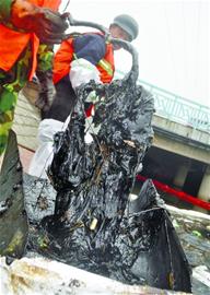 ????“截至目前,我們已經(jīng)清理了五六噸污油。剛開始,我們集中在古力口處清理。后來(lái)污油淌進(jìn)河里,我們又沿河進(jìn)行清理。事發(fā)后流到下水道里的污油至少有10噸,要想清理干凈還需要一段時(shí)日?!边@名施工負(fù)責(zé)人介紹。