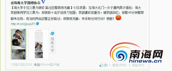 ????12月21日南海網(wǎng)報道了《海大男生抓小偷遭多名持刀男報復砍傷》引起了廣大網(wǎng)友的關注。12月22日,記者從??诩t島邊防派出所了解到,案件已經(jīng)移交美蘭公安分局刑警隊偵辦。而對于今天有學生在微博上質(zhì)疑警方出警慢、沒有及時抓獲持刀傷人的嫌疑人,讓其從現(xiàn)場跑掉。目前,??诿捞m公安紀檢部門介入調(diào)查。