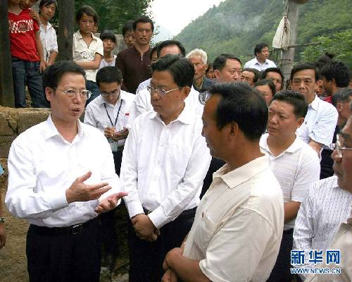 2008年6月18日,張高麗在地震重災(zāi)區(qū)陜西省寧強(qiáng)縣漢源鎮(zhèn)亢家洞村五里坡組,與當(dāng)?shù)仡I(lǐng)導(dǎo)同志共同研究天津市對口支援該縣恢復(fù)重建工作。新華社記者劉書云 攝