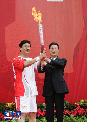 2008年8月1日,張高麗將奧運(yùn)火炬?zhèn)鬟f給天津市第一名火炬手——全國勞動模范、天津港工人孔祥瑞。新華社發(fā)(宋子明攝)