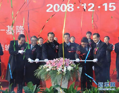 2008年12月15日,張高麗(前右三)與中國國民黨榮譽(yù)主席連戰(zhàn),全國政協(xié)副主席鄭萬通,交通運(yùn)輸部部長李盛霖,中共中央臺(tái)辦、國務(wù)院臺(tái)辦主任王毅,海峽兩岸關(guān)系協(xié)會(huì)會(huì)長陳云林等在天津東疆保稅港區(qū)舉行的海峽兩岸海上直航首航儀式上共同按下首航啟動(dòng)儀式按鈕。新華社記者劉海峰 攝