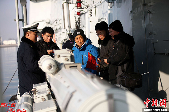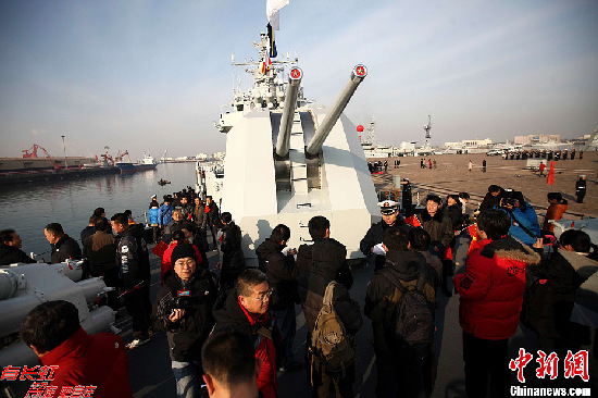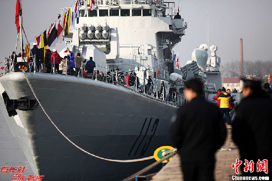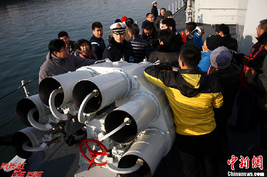 12月26日,中國(guó)海軍導(dǎo)彈驅(qū)逐艦“青島艦”在青島某軍港對(duì)外開(kāi)放,青島市民登上軍艦,與艦載直升機(jī)、特戰(zhàn)裝備零距離接觸?!扒鄭u艦”隸屬于海軍北海艦隊(duì),被譽(yù)為“中華第一艦”,曾多次代表中國(guó)海軍承擔(dān)出國(guó)訪問(wèn)任務(wù),執(zhí)行過(guò)亞丁灣海域護(hù)航等重大任務(wù)。(中新社發(fā)徐崇德 攝)