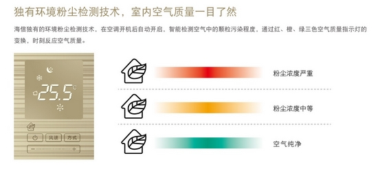 ????據(jù)悉,海信這款PM2.5空調(diào)創(chuàng)造性地采用了海信獨(dú)有的環(huán)境粉塵檢測技術(shù),在空調(diào)開機(jī)后自動開啟,智能檢測室內(nèi)空氣中的顆粒污染程度,通過紅、橙、綠三色空氣質(zhì)量指示燈的變換,時刻反應(yīng)空氣質(zhì)量。消費(fèi)者可以隨時知曉家中的空氣質(zhì)量狀況,從而隨時根據(jù)需求開啟空調(diào)的凈化功能。