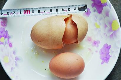 青島農(nóng)大生命科學學院一名研究員說,出現(xiàn)大個頭蛋中蛋的概率非常小,可能是雞蛋排出輸卵管的時候出現(xiàn)功能異常時產(chǎn)生的。據(jù)他分析,由于雞舍旁邊就是一只大黃狗的窩,母雞在生蛋時,黃狗突然狂吠起來,導致雞受到驚嚇輸卵管收縮快速分泌大量的蛋白質,形成小蛋,隨后輸卵管又分泌鈣質,形成“蛋中蛋”,“它的營養(yǎng)價值是一樣的,不影響食用。 ” (記者 王漢峰)