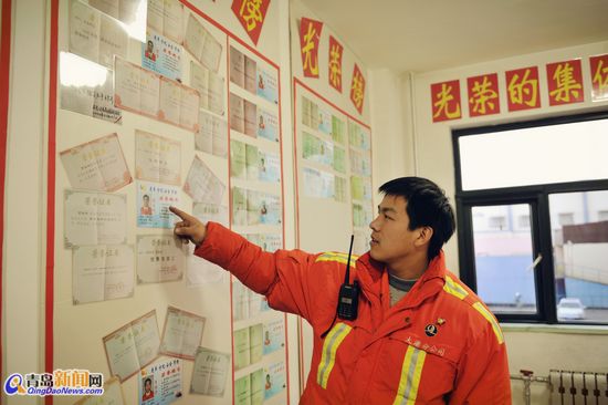 在機(jī)械二隊(duì)榮譽(yù)室里,賈自剛指著自己滿墻的榮譽(yù)證書,非常自豪