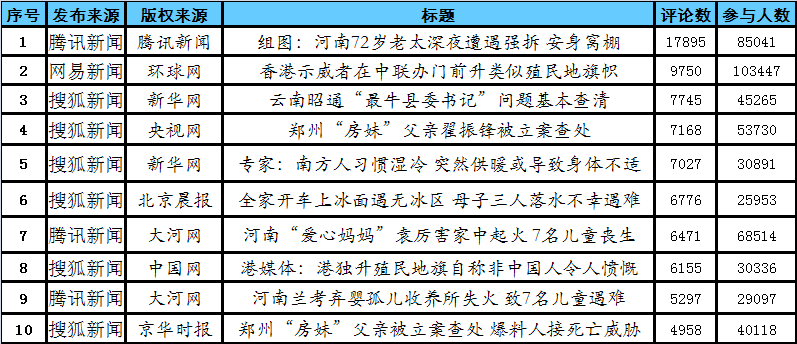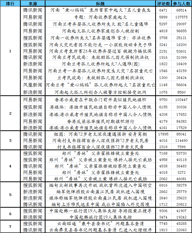 ?。ń刂箷r間:2013年1月5日11時) 人民網(wǎng)輿情監(jiān)測室輿情分析師 何新田 人民網(wǎng)輿情監(jiān)測室見習(xí)分析師 白 梅 人民網(wǎng)輿情監(jiān)測室見習(xí)分析師 張煥宇 綜合今日輿情數(shù)據(jù),今日輿情熱度最高的事件是: 河南蘭考孤兒收養(yǎng)所起火7名兒童遇難,熱度最高的單條網(wǎng)絡(luò)新聞是騰訊新聞“組圖:河南72歲老太深夜遭遇強拆安身窩棚”,截至今日上午11時,“河南蘭考孤兒收養(yǎng)所起火7名兒童遇難”相關(guān)話題位居今日輿情熱點排行第一位,已有至少60萬網(wǎng)友參與討論和超過4萬條網(wǎng)友評論。