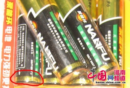 ????據(jù)了解,消費者2012年12月29日在鄭州某大型超市所購買的5號南孚聚能環(huán)電池外表和其他電池并無區(qū)別,但仔細一看就會發(fā)現(xiàn),電池尾部生產(chǎn)日期卻是“2013—01”,2013年的產(chǎn)品怎么會在2012年就上市呢?難道是電池穿越了?