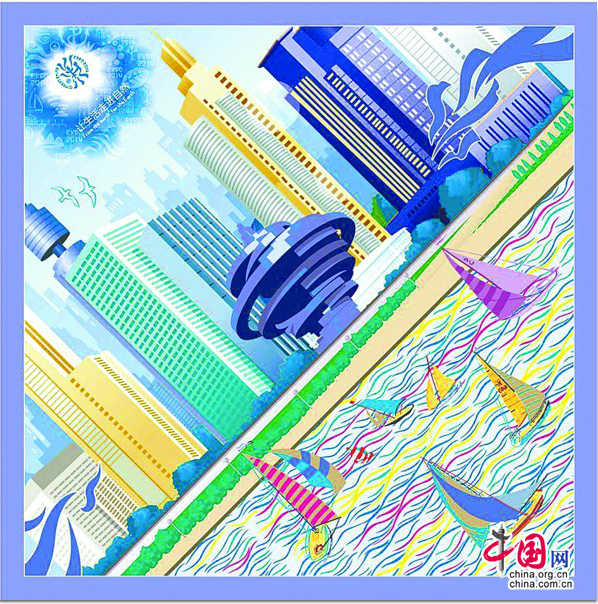 青島風(fēng)光系列絲巾有A、B、C、D四款,A、B以青島的建筑、國(guó)際帆船節(jié)、人文藝術(shù)以及整個(gè)以藍(lán)色為主的自然畫面。C、D以會(huì)徽的輔助圖形為基本元素,靈活的采用打散重組的方式進(jìn)行排版設(shè)計(jì),中心圖案以青島具有代表性的景物符號(hào)繪本為主體,以山、水、日、月等表現(xiàn)大自然的象形文字組合,展現(xiàn)出青島山海城渾然一體的深厚文化特色。