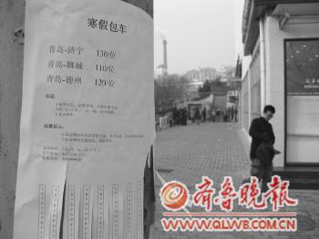 ????“聊城老鄉(xiāng)們,寒假即將來臨,為方便各位老鄉(xiāng)舒服到家,避免來回倒車麻煩,本人特在聊城車站找了N輛豪華大巴,票價絕對低?!?日,在青島大學(xué)東院內(nèi)一處顯眼的廣告欄上就貼著這樣一則“一起回聊城”的包車小廣告,在另外的幾處宣傳欄上,類似的小廣告更是數(shù)不勝數(shù),有的為了醒目直接標(biāo)上城市地名,還有非常吸引人的極低價格,一則“寒假包車”的小廣告上直接標(biāo)出青島至濟(jì)寧130元每位的價格。