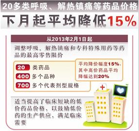 新華社1月8日電 國家發(fā)展和改革委8日宣布,從2013年2月1日起調(diào)整呼吸、解熱鎮(zhèn)痛和專科特殊用藥等藥品的最高零售限價,共涉及20類藥品、400多個品種、700多個代表劑型規(guī)格,平均降價幅度為15%,其中高價藥品平均降幅達到20%。