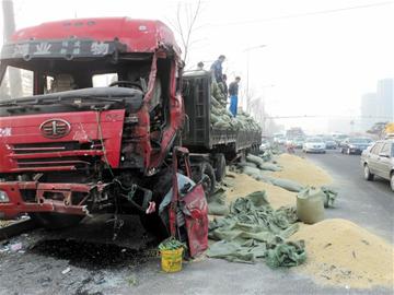 前晚10時許,這輛車滿載著26噸黃豆向北行駛準備開往壽光,可司機剛駕車沿環(huán)灣路向北行駛至事發(fā)地點時,兩道強光一下從左側射來——一輛滿載泥土的大貨車趁著路中央的隔離帶露出5米多寬的距離準備掉頭,結果剎車不及一下撞在了半掛車車頭上。當場失去平衡的半掛車一陣晃動,車斗里的40多袋黃豆一下沖破隔離欄摔倒地上,鋪滿了整個路面。由于環(huán)灣路臨近海邊,海風又將黃豆吹落至前后約200米遠的路段。