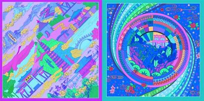 此款方巾從國(guó)粹京劇吸取創(chuàng)意元素,將京劇裝束中的女性頭飾融人中國(guó)傳統(tǒng)圖案中,并用時(shí)尚的紅紫兩色點(diǎn)染,華麗柔美,風(fēng)情萬(wàn)種。