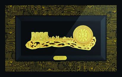 擺件以抽象鑰匙為形象,寓意開(kāi)啟2014年青島世園會(huì)。產(chǎn)品以青島典型歐陸風(fēng)情的“萬(wàn)國(guó)建筑”和代表著青島的特色海岸線襯托會(huì)徽LOGO,寓意太陽(yáng)初升浮山灣海韻的曙光,其精髓意在“上善若水”的品德。精致的浮雕工藝,細(xì)膩的線條,再加上鑲嵌的72顆施華洛水鉆和24K純金電鍍,使產(chǎn)品顯得高檔、華麗。