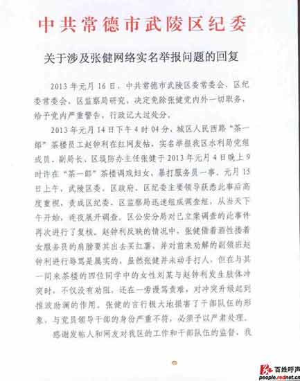 ????1月14日,一則網(wǎng)友的實(shí)名舉報(bào)帖出現(xiàn)在紅網(wǎng)《百姓呼聲》欄目,帖文稱“武陵區(qū)水利局副局長(zhǎng)張健酒后調(diào)戲婦女,暴打服務(wù)員”。帖子發(fā)出后引起武陵區(qū)主要領(lǐng)導(dǎo)的重視,目前,涉事的副局長(zhǎng)張健被免職。
