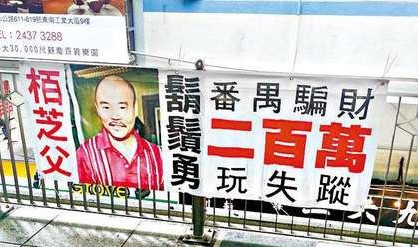 媒體在香港中環(huán)及灣仔等發(fā)現(xiàn)胡須勇被追債的巨型海報,追債海報掛在中環(huán)環(huán)球大廈樓下馬路旁的欄桿,據(jù)了解,胡須勇的辦公室正設(shè)在環(huán)球大廈內(nèi)。追債海報印上胡須勇早前上庭的紅衫大頭相,更在相旁大字標(biāo)題寫上“柏芝父”(胡須勇),指他在內(nèi)地行騙,騙去債主200萬后“玩失蹤”,而同樣的海報也掛在灣仔地鐵站通往會展的天橋上,該處人來人往頗惹人注目。胡須勇是江湖中人,由于傳言江湖有多個胡須勇,債主特別列明欠債失蹤的是柏芝父,柏芝又再被卷入事件。
