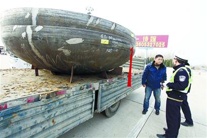 ????上午11時許,一輛拉著兩個“超級大碗”的貨車引起高速交警注意,由于大碗直徑達到3米,超過了車體的寬度,兩邊的擋板都垂落在下方。大碗底部是圓的,因此用三角鐵焊在了車體上??吹浇痪瘷z查,駕駛員連忙拿出了 《山東省運載超限物品車輛通行證明》,表明自己運輸行為的合法?!拔覐奶┌策\載兩個油罐的封頭到威海石島,全程走高速,限速每小時70公里?!瘪{駛員趙某說。