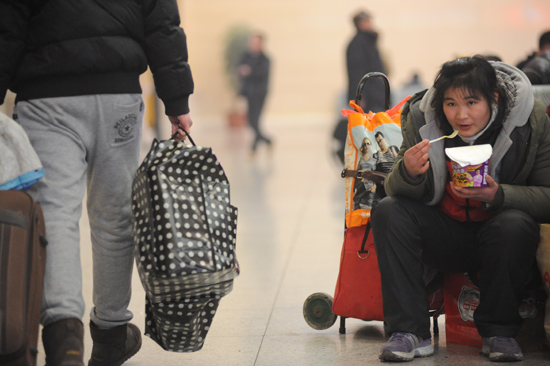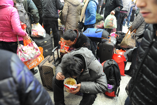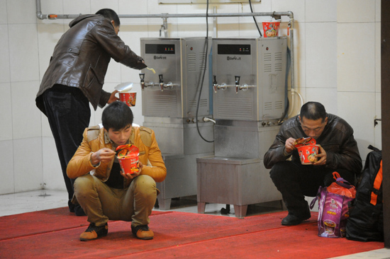 幾名旅客為了回家,蹲在火車(chē)站內(nèi)的開(kāi)水間里吃泡面