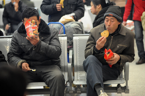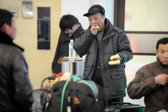 一位旅客啃了幾個(gè)干餅簡(jiǎn)單地填飽肚子