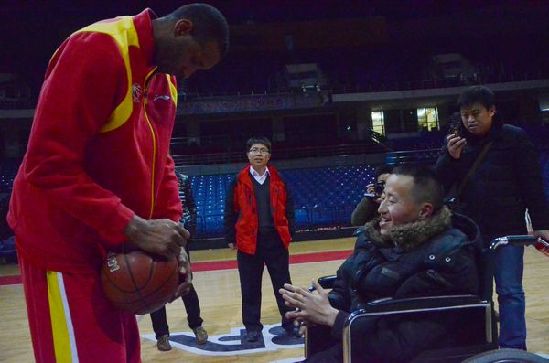 ????青島新聞網(wǎng)2月1日訊 2月1日晚上,青島雙星男籃主場在國信體育館對陣浙江廣廈隊(duì),看臺上一位坐在輪椅上的殘疾人關(guān)注著賽況,神情緊張而興奮。他叫吳石磊,來自濱州農(nóng)村,此前最大的夢想就是見到自己的偶像——麥蒂,今天他不但見到了麥蒂,還從麥蒂手中接到一個(gè)簽名籃球?!耙磺卸枷褡鰤粢粯樱「兄x青島新聞網(wǎng)微博幫我夢想成真。”他激動地說。