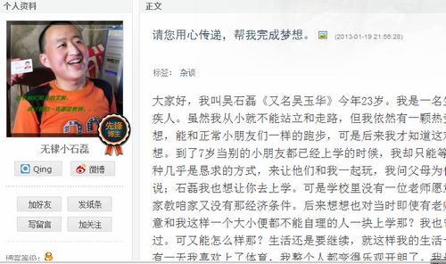 吳石磊在網(wǎng)上的內(nèi)心獨(dú)白被全國很多愛心網(wǎng)友微博轉(zhuǎn)發(fā)