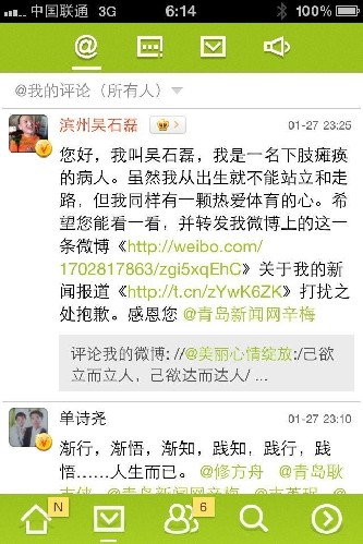 ????微博給力,青島新聞網(wǎng)官微幫他圓夢