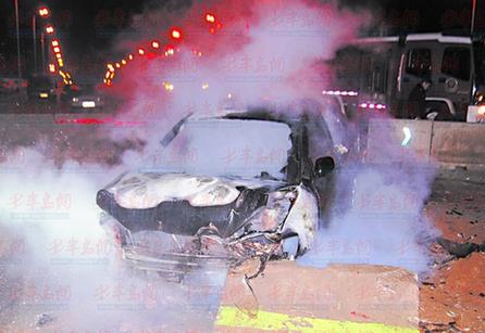 ????“一開始撞上時并未起火,大約過了10分鐘,車子的引擎蓋才開始冒出濃煙和火苗!”最先發(fā)現(xiàn)起火的一名的哥告訴記者,當(dāng)晚11時30分,他正在附近送客人,目睹了車禍現(xiàn)場,大約10分鐘后他再次返回現(xiàn)場時,事故車已經(jīng)開始燃起火苗,他趕緊將出租車停下并拿出隨車攜帶的滅火器沖到車前滅火。幸虧消防隊員來得及時,要不然引爆了油箱也是很危險的。采訪時,記者并未在現(xiàn)場找到事故車的司機。消防隊員告訴記者,他們也沒看到司機和其親友。