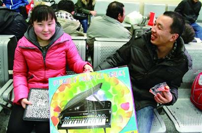 ????小薛夫婦二人都是中鐵三局的工人,老家在吉林長春。他們在青島地鐵三號線工作已經(jīng)1年了,一直沒回家,最讓他們掛念的是剛滿兩歲的兒子。夫婦倆希望把兒子往音樂方面培養(yǎng),這次回家過年,專門給兒子買了個玩具電子琴當(dāng)禮物?!皬那鄭u回老家,肯定要帶一些青島的特產(chǎn)。”小薛告訴記者,他給家里親戚買了青島當(dāng)?shù)馗珊X洠b了滿滿一拉桿箱。“其實青島的干海貨在老家超市里也有賣,不過從這里帶回去覺著更正宗,更能體現(xiàn)咱的心意。”小薛說,他總覺著回家在超市買的青島特產(chǎn)“情誼就輕了”。 (記者 趙健鵬 實習(xí)生 孫忠曉 于立軒)