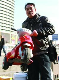 ????火車站廣場上的寒風(fēng)有些刺骨,可年過六旬的吳善松坐在廣場樓梯上不時露出甜蜜的笑容?!斑@輛大摩托車是給孫子買的,孫子一直說想要輛電動摩托,有點貴,我狠狠心才買的?!眳巧扑擅磉叺囊惠v塑料電動摩托車告訴記者,他老家在安徽金寨,和同鄉(xiāng)“組團(tuán)”來青,在一個施工隊打工,一干就是兩年,這是來青后第一次返鄉(xiāng)過年。吳善松說,他離開老家時,孫子只有兩歲,這兩年和家人打電話,聽到孫子在電話那頭叫“爺爺”,他激動得眼淚直流?;丶疫^年前,他問孫子想要什么禮物,孫子說想要電動摩托車。“只要孫子喜歡,花多少錢我都愿意?!眳巧扑烧f。