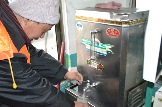 ????環(huán)衛(wèi)工人李姐在溫馨巴士31路隊調(diào)度室里接熱水