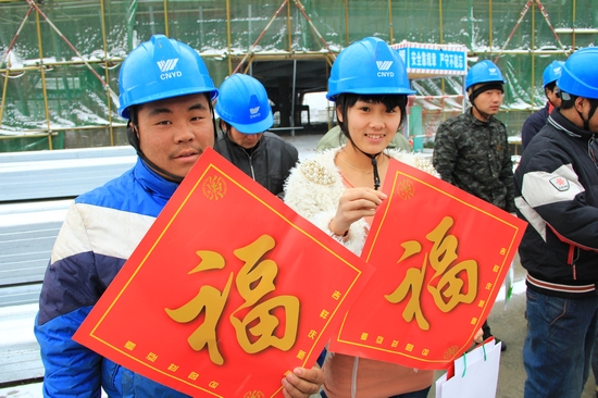 原來(lái),女孩叫馨悅,93年生,今年剛滿20歲,來(lái)自吉林長(zhǎng)春榆樹(shù)市懷家鎮(zhèn),半個(gè)月前特意趕到青島,陪駐守工地的丈夫小許過(guò)新年。在這條件艱苦的工地上,她做不了重活,倒是成了一個(gè)很好的小“管家婆”,幫工友們打掃衛(wèi)生洗衣服燒開(kāi)水,每天也做不少的活。這次送春聯(lián)活動(dòng),她儼然已經(jīng)把自己當(dāng)成了工地上的一份子,大大方方地站在工人隊(duì)列里。