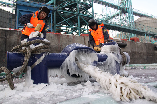 春節(jié)大會戰(zhàn),輪駁工人現(xiàn)場除冰