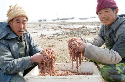 ????青島節(jié)后第一船小海鮮上岸了。昨天中午,青島即墨田橫鎮(zhèn)楊家后村漁民李云林駕船到近海,用釘網(wǎng)4個(gè)小時(shí)拉回上百斤新鮮的海蚰蜒等小海鮮。等候在岸上的海鮮店小老板當(dāng)場(chǎng)以30元一斤全部收走。 ????海蚰蜒很快就入網(wǎng) ????“節(jié)后第一網(wǎng),收獲還不錯(cuò)。”昨天中午,即墨田橫海域開始漲潮,楊家后村50多歲的漁民李云林和雇工拖著裝滿船艙的海鮮上岸了。“這個(gè)季節(jié)正是打海蚰蜒的時(shí)候。”老李告訴記者,前天晚上,他們就收拾好了漁網(wǎng),昨天凌晨4點(diǎn),在家吃了餃子后,放了“出海鞭”就出海了。 ????“捕撈海蚰蜒,一種是拖網(wǎng),另一種是釘網(wǎng)。”老李說,他們將船開出4里開外后,根據(jù)海水的流向,將一張10多米的大釘網(wǎng)撒進(jìn)了海里,不一會(huì),10多斤的海蚰蜒就進(jìn)了網(wǎng)。隨后又下了幾網(wǎng),收獲約有百余斤海蚰蜒。老李和雇工又撒下了另一張網(wǎng),開始捕獲小魚蝦。經(jīng)過4個(gè)多小時(shí)的捕撈,老李的船艙已經(jīng)裝得差不多了,尤其是海蚰蜒,足足兩大籮筐。老李說,由于海上氣溫很低,他們出海捕撈不到10分鐘工夫,手就凍僵了。 ????小海鮮被高價(jià)收購 ????“這些小海鮮,都被提前訂購了?!弊蛱熘形纾浾呖吹?,老李的第一船海鮮還沒上岸,就有一名小老板開著小貨車來等著拉貨了。經(jīng)過現(xiàn)場(chǎng)稱重,老李的100多斤海蚰蜒,以每斤30元的價(jià)格賣給了海鮮店老板,而小魚蝦也很快被幾家漁家酒店搶光了。記者注意到,除了海蚰蜒外,還有一些黃鼓魚、小黃花等。由于節(jié)后極少有漁民出海,這些小海鮮比平時(shí)貴了一倍。 ????“海蚰蜒在青島海域量很少,因?yàn)椴稉破饋聿蝗菀?,到?月初,會(huì)有更多的海蚰蜒上岸,到時(shí)市民就可以嘗鮮了。”在即墨鰲山衛(wèi)街道辦柴島碼頭,一名漁民告訴記者,每年過了正月十五才有海船出海捕撈作業(yè),到那時(shí)本地的魚蝦等小海鮮就會(huì)大量上岸。 ????相關(guān)鏈接 ????海蚰蜒很鮮美 ????記者注意到,海蚰蜒通體粉紅色,長(zhǎng)20-30厘米,呈圓柱形,身體一側(cè)密密長(zhǎng)滿了短短的像是腳一樣的東西。在田橫島,漁民叫這種東西為海蚯蚓、海蚰蜒,只在每年的春節(jié)到農(nóng)歷二月二前后才能捕到。過了這一個(gè)月,就只能在海灘上挖掘。 ????海蚰蜒是青島當(dāng)?shù)貪O民的叫法,正規(guī)的名字叫沙蠶,干制后,煮湯白如牛奶,味極鮮美,有“天然味精”之稱。也可以炒雞蛋,油炸后酥松香脆,為下酒佳肴。(記者康曉歡) |