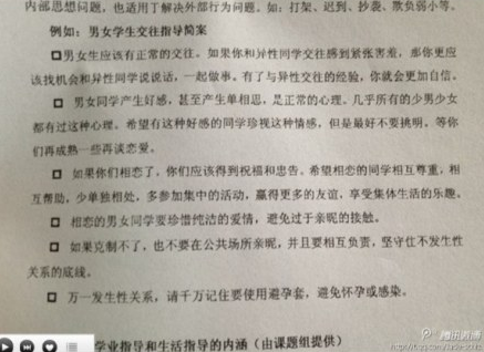 ????2月12日,在新浪微博出現(xiàn)了一條附帶照片的帖子,照片上內(nèi)容是“男女生交往指導(dǎo)簡(jiǎn)案”,里面涉及到男女生如何正常交往、保持純潔的愛情、單相思時(shí)如何處理,甚至還有一些關(guān)于發(fā)生性關(guān)系的注意事項(xiàng)等,看上去十分吸引眼球,并且在微博的文字上明確說(shuō)這是島城一所擁有百年歷史的中學(xué)。截止到2月18日,該微博的轉(zhuǎn)發(fā)量已經(jīng)達(dá)到六千余條,引發(fā)不少網(wǎng)友的熱議。