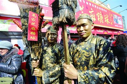 ????“我們就是想把活人雕塑的現(xiàn)代藝術(shù)做出傳統(tǒng)味道?!焙蛡鹘y(tǒng)藝人“趕時(shí)髦”不同,高家糖球攤位前的兩名現(xiàn)代藝術(shù)表演者卻挖空心思要“回到過去”。兩名活人雕塑表演者渾身黃銅色,頭戴瓜皮帽、身穿長(zhǎng)袍,肩上扛著插滿糖球的草靶子,不斷變換著各種叫賣動(dòng)作,吸引了眾多趕會(huì)市民來合影。表演活人雕塑的馬明告訴記者,他和另外一個(gè)“銅人”都是青島大學(xué)美術(shù)系的大三學(xué)生,這次趁著節(jié)會(huì)來勤工儉學(xué)?!拔覀儙讉€(gè)同學(xué)成立了藝術(shù)工作室,3年來參加了不少傳統(tǒng)節(jié)會(huì)?!瘪R明說,兩年前他在棧橋看到有活人雕塑,覺著憑借自己的美術(shù)功底繪制這樣的行頭不算難事,就和3名同學(xué)成立工作室對(duì)外“接活”。去年在一次民間山會(huì)中認(rèn)識(shí)了高家糖球的高士湘,這次已經(jīng)是第三次在高家糖球前亮相。高明說,他們的裝扮以傳統(tǒng)為主,長(zhǎng)袍馬褂、磨刀老漢、釣魚蓑翁……都是他們的強(qiáng)項(xiàng),讓現(xiàn)代藝術(shù)穿越到百年前。