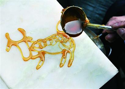 ????與捏面人師傅一樣,做糖畫的藝人也極富創(chuàng)新精神,糖畫攤上的作品不但有老鼠偷油、葫蘆蟈蟈……更多的作品還是具有現(xiàn)代抽象繪畫意味的糖畫?!皞鹘y(tǒng)手藝添加點(diǎn)時(shí)尚元素,年輕人會(huì)更喜歡?!眲⒌潞煾等齻€(gè)手指捏著一小勺糖稀,在白石板上左勾右畫,一只造型新穎的公牛就出來了。記者發(fā)現(xiàn),這只糖牛的造型夸張,與傳統(tǒng)紋樣完全不同,很有現(xiàn)代繪畫的味道。“你說對(duì)了,我這是參考了當(dāng)代工藝美術(shù)大師韓美林的作品加工的?!眲煾档靡獾卣f,他的許多糖畫作品都是融入了當(dāng)代美術(shù)的夸張抽象手法。
