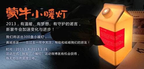 除了線下的行動(dòng),蒙牛在線上的溫暖關(guān)懷也一直在進(jìn)行。春節(jié)前夕,蒙牛乳業(yè)官方微博發(fā)起的“小暖燈”活動(dòng),將2012年的感動(dòng)瞬間集合到一起,令人動(dòng)容;蒙牛乳業(yè)官方發(fā)起的“點(diǎn)滴幸福,此刻最濃”春節(jié)回家活動(dòng),讓網(wǎng)友在參與的同時(shí),感受到了家的溫暖。