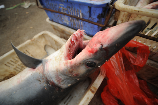 青島新聞網(wǎng)2月22日訊22日上午,記者在開(kāi)平路早市看見(jiàn),一個(gè)賣魚(yú)的攤位上放著兩條一米多長(zhǎng),血淋淋的鯊魚(yú)。鯊魚(yú)通體藍(lán)灰色,腹部呈白色,張著大口,一顆顆如同尖刺一樣的牙齒裸露在外面。其中一條鯊魚(yú)已經(jīng)被市民瓜分成幾塊,魚(yú)案上淌滿了鮮血。