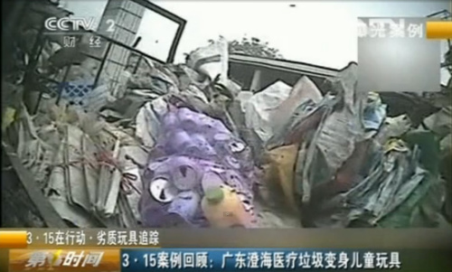 在去年央視315晚會(huì)上,曝光了廣東汕頭的垃圾玩具事件,玩具行業(yè)是廣東汕頭市澄海區(qū)的支柱產(chǎn)業(yè),澄海當(dāng)?shù)嘏c玩具相關(guān)的企業(yè)有三千多家,擁有一大批馳名商標(biāo)、名牌產(chǎn)品和專利授權(quán)產(chǎn)品。然而我們的315記者卻發(fā)現(xiàn),塑料瓶,密封膠瓶,甚至一些輸液管這樣的醫(yī)療垃圾,居然都成了當(dāng)?shù)鼗厥照镜膿屖重?。更可怕的是,這些沒(méi)經(jīng)過(guò)任何處理的醫(yī)療垃圾,最終卻變成了孩子們手中的玩具。