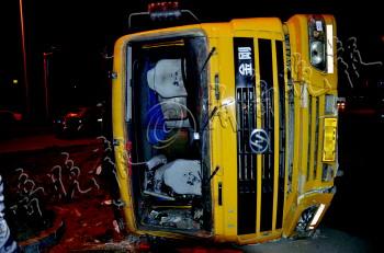 側(cè)翻大貨車車頭玻璃已經(jīng)粉碎。