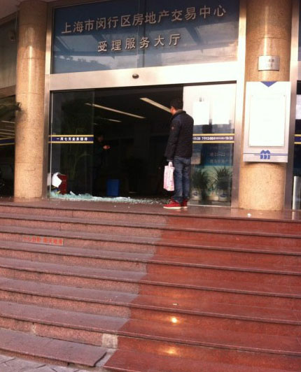3月5日8點(diǎn),上海閔行房產(chǎn)交易中心玻璃門被擠碎。