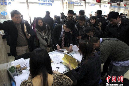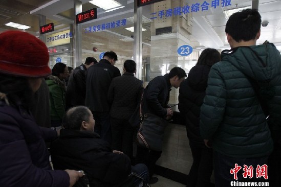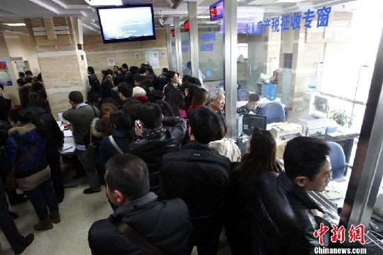 3月3日,上海二手房交易中心,窗口前排隊的交易者。3月1日,“新國五條”細則發(fā)布,其中明確二手房交易中的個人所得稅將會按照個人所得的20%征收。(湯彥俊 攝)