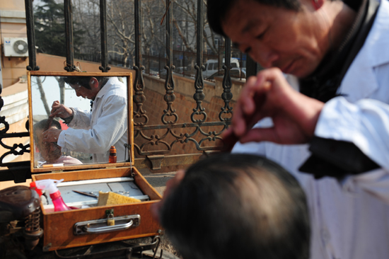 “剃個頭十分鐘就好,現(xiàn)在理發(fā)的人越來越少,都是六七十歲的老人。”賈師傅告訴記者,現(xiàn)在理發(fā)漲價了,5塊錢一個。不過這價錢也已經(jīng)有五六年了。張力偉 攝