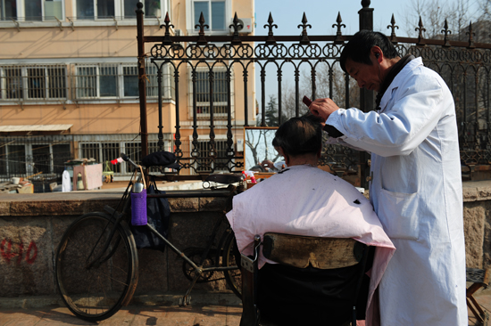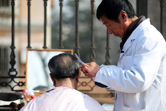 簡(jiǎn)單的工具寒酸的行頭與現(xiàn)在裝修豪華的理發(fā)店相比寒磣不少,可仍然吸引了無數(shù)老年人前來。張力偉 攝