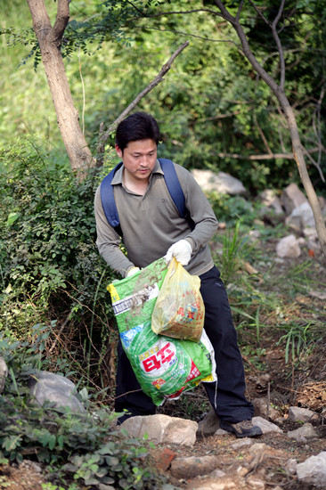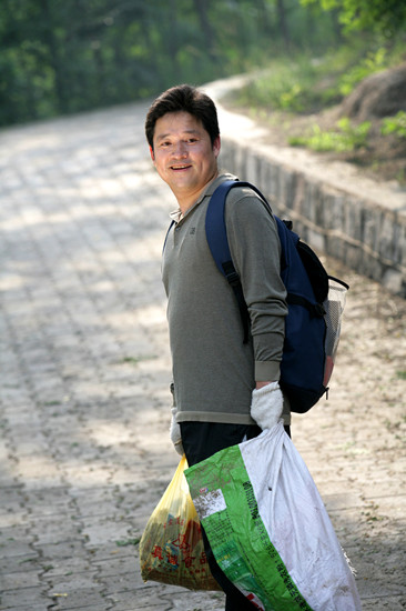 ??? 青島新聞網(wǎng)3月8日訊 工作中,他是西裝革履的銀行客戶經(jīng)理,是黨員示范崗的優(yōu)秀代表;到了周末,他好像變成了另一個(gè)人,戴著太陽帽和線手套、背著裝滿編織袋的特制大書包、拿著一米長的巨型鑷子。九年來,他翻山越嶺、走遍崎嶇山路,用自己的雙腳丈量浮山每一寸土地,用雙手拾遍漫山垃圾。他就是王德洋,青島人更愿意稱呼他“青島環(huán)保哥”。